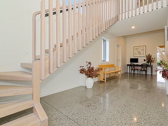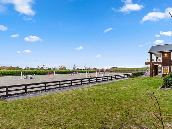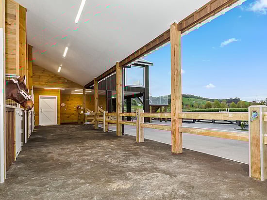 A well-lit floating staircase with timber bannister leads up to the open-layout kitchen, dining and lounge spaces which survey an equestrian arena.