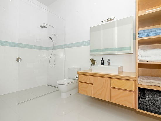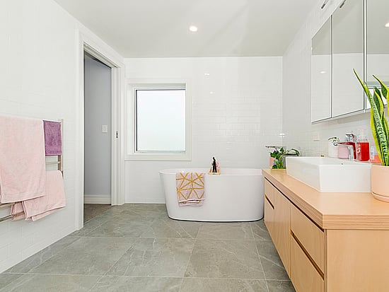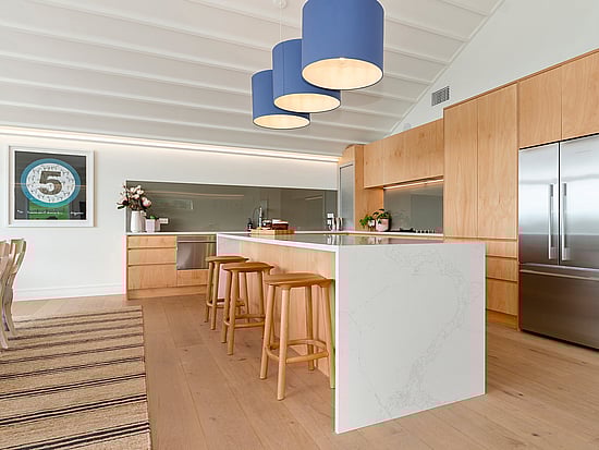 Beautiful natural timber kitchen cupboards and a 3.2m island bench provide a further nod to the old-school brief. Meanwhile, clean, sleek lines place this elegant kitchen – and indeed home – firmly in the present.