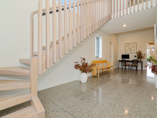 A well-lit floating staircase with timber bannister leads up to the open-layout kitchen, dining and lounge spaces which survey an equestrian arena.